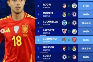 西班牙球员转会费榜:凯帕8000万欧居首,罗德里次席&祖比门迪第6