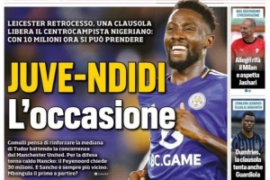 体育资讯7月7日讯 《都灵体育报》头版消息,尤文图斯相中莱斯特城后腰恩迪迪。