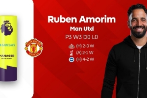 阿莫林成为自2023年11月滕哈赫之后首位获得此奖项的曼联主教练。曼联在10月份的英超比赛中2-0战胜了势头强劲的桑德兰;2-1击败了卫冕冠军利物浦,这是他们在近10年来首次在安菲尔德取胜;4-2战胜布莱顿。