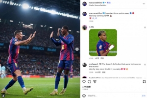 拉什福德社媒晒同莱万庆祝照:重要的客场3分,我们继续努力