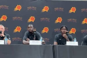 体育资讯7月8日讯 今天,太阳为球队新秀举行了新闻发布会。10号秀马卢阿奇(图左二)接受了采访。
