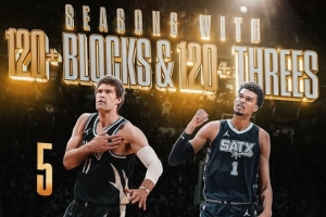 单赛季同时达成120+三分和盖帽:大洛5次,文班2次,此外没人能多次做到。