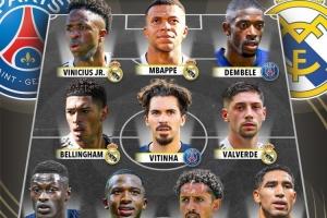 前锋:维尼修斯(皇马)、姆巴佩(皇马)、登贝莱(巴黎)