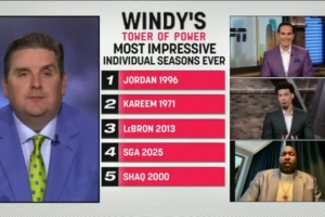 文霍斯特表示历史前五的赛季个人表现排名依次为:“1996年乔丹、1971年贾巴尔、2013年詹姆斯、本季的亚历山大和2000年的奥尼尔。”