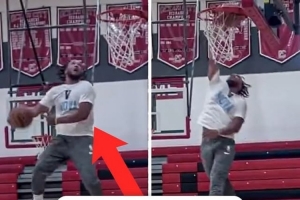 体育资讯7月9日讯 近日,尼克斯球星布伦森在训练中完成一记舒展的大风车扣篮。