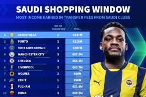 体育资讯7月9日讯 德转统计各俱乐部向沙特球队卖人收入,维拉以1.37亿欧居首,波尔图1.1亿欧第二,巴黎1.03亿欧第三。