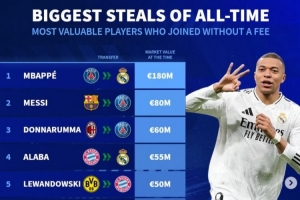 体育资讯7月10日讯 《转会市场》统计了历史自由身离队身价榜,姆巴佩以1.8亿欧元居首。