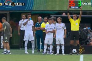 体育资讯07月10日讯 世俱杯半决赛,巴黎对阵皇马。64分钟,皇马连换三人,莫德里奇、迪亚斯、米利唐出场,贝林厄姆、维尼修斯、阿森西奥被换下。