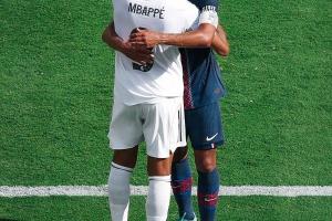 赛后巴黎队长马尔基尼奥斯也与前巴黎队友姆巴佩紧紧相拥致意。
