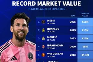 38岁及以上球员的身价排行:梅西1800万欧居首,C罗1500万欧第二