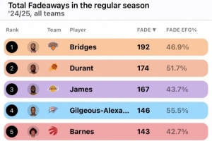 上赛季后仰跳投次数榜:大桥布里奇斯第一 KD&老詹分列二三