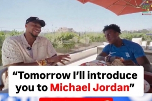 直播中,字母哥提到自己第二天要去见乔丹,问甲亢哥想不想去。甲亢哥说想去,然后字母哥说:“但你可不敢朝着乔丹(像你平时一样)瞎嚷嚷,乔丹会笑话你的。”