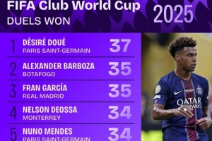 体育资讯7月11日讯 本届世俱杯仅剩巴黎vs切尔西的决赛,数据机构squakwa也统计了本届赛事成功对抗情况,巴黎20岁前锋杜埃领跑。