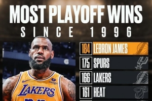 美媒BF晒图,詹姆斯季后赛胜场数184场,超越1996年以来所有的球队,球队里排名前五的是:马刺175场、湖人166场、热火161场、凯尔特人157场、勇士118场。