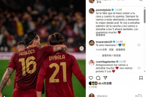 体育资讯7月12日讯 迪巴拉今天在Instagram发文,告别加盟博卡青年的罗马队友帕雷德斯。
