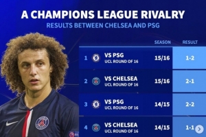 15-16赛季欧冠16强战:切尔西1-2巴黎、巴黎2-1切尔西(巴黎总比分4-2晋级)