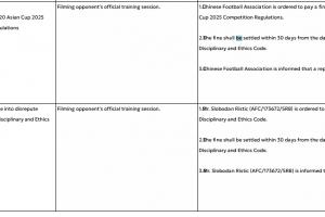 1.中国足协违反《2025U20亚洲杯竞赛规程》第52.1条规定,被罚款2000美元。