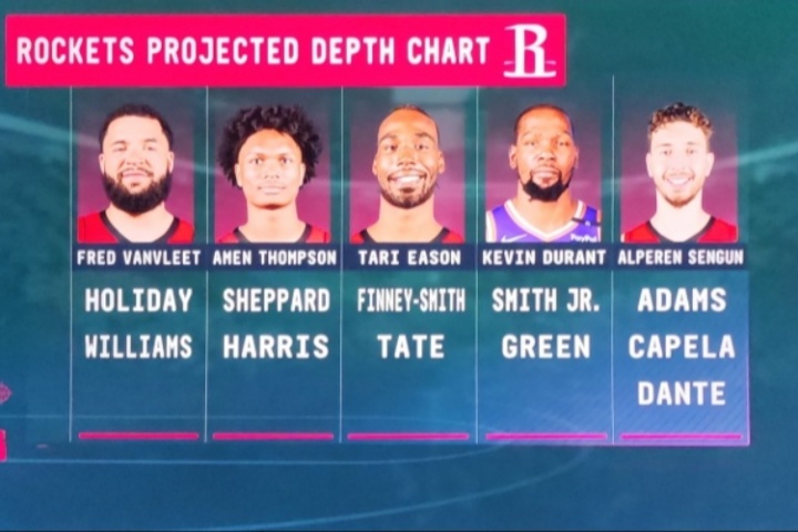 体育资讯07月12日讯 今日夏联对阵快船,火箭总经理斯通在现场接受采访时,转播方晒出的火箭阵容深度图: