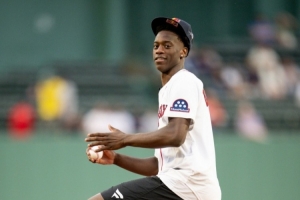 体育资讯7月12日讯 波士顿红袜队官方晒图:AJ-迪班萨为球队的比赛开球。