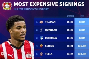 体育资讯7月12日讯 埃因霍温中场蒂尔曼已经官宣转会勒沃库森,《转会市场》统计显示他也并列为药厂队史标王。