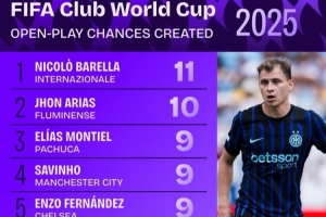 体育资讯7月13日讯 本届世俱杯仅剩巴黎vs切尔西的决赛,数据机构squakwa也统计了本届赛事运动战创造机会情况,巴雷拉力压琼-阿里亚斯居首。