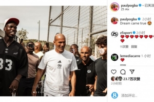 博格巴与齐达内一起参加活动,他在社交媒体上晒出合照,并配文:“梦想成真。”