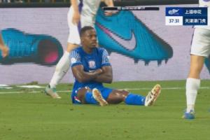 体育资讯06月25日讯 中超第15轮,上海申花vs天津津门虎,比赛第37分钟,马纳法禁区内突破后倒地,裁判没有表示,随后马纳法双手交叉在地上久坐不起表示抗议,VAR介入示意没有点球。