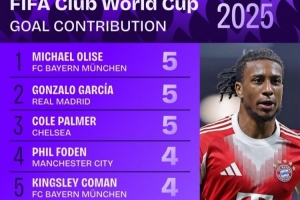 体育资讯7月14日讯 世俱杯已经完赛,squakwa也统计了本届赛事的直接参与进球榜,奥利塞、贡萨洛-加西亚和帕尔默均参与5球最多。