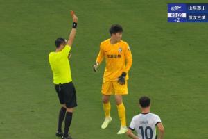 体育资讯06月25日讯 泰山vs三镇上半场最后阶段,三镇门将出击撞倒谢文能,裁判出示红牌将其罚下!