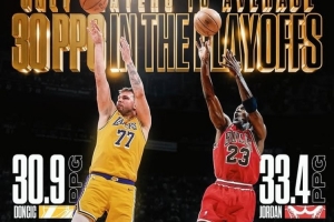 乔丹生涯179场季后赛,场均33.4分;东契奇55场季后赛,场均30.9分。