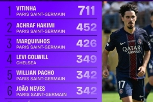 世俱杯传球排名:维蒂尼亚711次断层领先,前十巴黎占7位