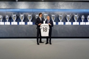 签约后,A费收到了一个伯纳乌球场模型复制品、一块手表以及一件印有其名字的18号球衣。