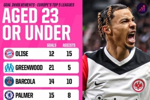 欧洲五大联赛23岁及以下球员进球+助攻总榜: