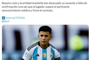 体育资讯07月16日讯 马竞官方消息,与博塔弗戈就24岁阿根廷中场阿尔马达的转会达成协议!马竞官方表示,双方已达成一致,这笔交易将在球员通过体检并签订合同后确认。
