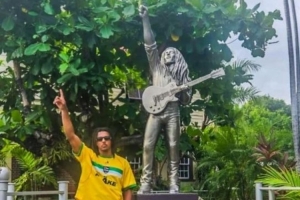 其他照片中还展示了孔德在金斯敦鲍勃-马利博物馆故居的身影,孔德在这位雷鬼音乐之王故居正门前的雕像旁摆出相同手势合影留念。