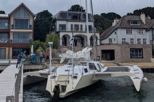 这艘价值2.5万英镑的三体赛艇在强风中被冲入百万富翁大道北岸,四名船员安全脱险,但这艘名为Three Cheers的船体卡在了码头下方。