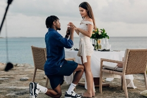 姆班古拉为女友戴上了一枚上面有水滴形状的钻戒。