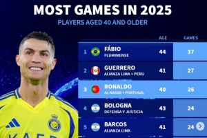 刚刚随弗鲁米嫩塞打进世俱杯四强的44岁老门将法比奥以37场居首,曾效力过拜仁的秘鲁41岁锋线老将保罗-格雷罗在今年为利马联盟和秘鲁国家队共计出场27次,40岁的C罗则为利雅得胜利和葡萄牙国家队出场26次。