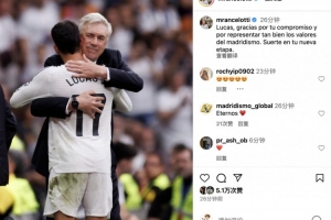 安切洛蒂社媒写道:“卢卡斯,感谢你的付出,以及你对皇马精神的出色诠释。祝你在新的阶段一切顺利。”