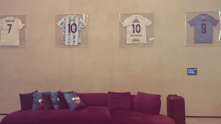 内马尔社媒晒球衣收藏:皇马C罗、阿根廷梅西、桑托斯内马尔、乌拉圭苏亚雷斯