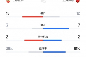 体育资讯7月18日讯 中超第17轮,上海海港3-1击败长春亚泰。本场比赛数据出炉。