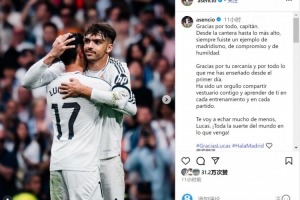 劳尔-阿森西奥社媒晒出与巴斯克斯拥抱的照片,并写道:“感谢你所做的一切,队长。