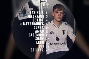 曼联首发:1-巴因德尔、3-马兹拉维、4-德里赫特、30-莱昂、23-卢克肖、43-科利尔、18-卡塞米罗、16-阿玛德、8-B费、32-奥比、10-库尼亚