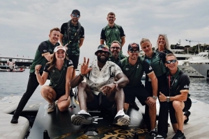 詹姆斯前往支持自己所拥有的AlUla队,鼓励队员们在今日的正赛中取得好成绩。在俯身参观赛艇驾驶舱内部时,詹姆斯表示:“里面好热啊。我喜欢那个控制器,看起来像是游戏手柄那般。我对比赛感到兴奋。我们应该拍一张全队合影。”