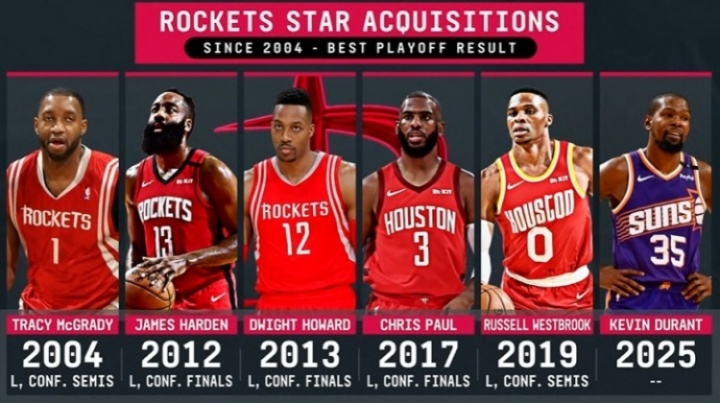 体育资讯07月20日讯 官方转播晒出了火箭21世纪以来球队做的球星交易以及他们带领球队在季后赛达到的最好成绩: