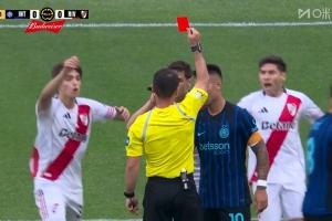 比赛第65分钟夸尔塔最后一人防守铲倒姆希塔良,被直红罚下,河床现排名第3,10人作战,局势很危险。