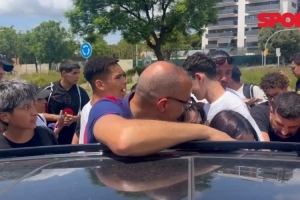 众多球迷在巴萨基地外等待球员,孔德停留超过10分钟,耐心地为球迷签名,与他们合影。