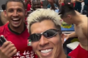 视频中,河南队外援纳萨里奥戴着墨镜领舞,全队在更衣室又唱又跳庆祝胜利。