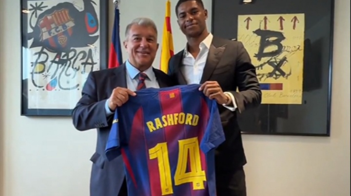 巴萨官推晒视频,拉什福德与拉波尔塔一起手持巴萨14号球衣,配文:“我们的新14号💙❤️”。