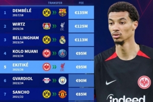 体育资讯7月24日讯 德国转会市场网统计,埃基蒂克成为德甲历史并列第四贵的转出交易。